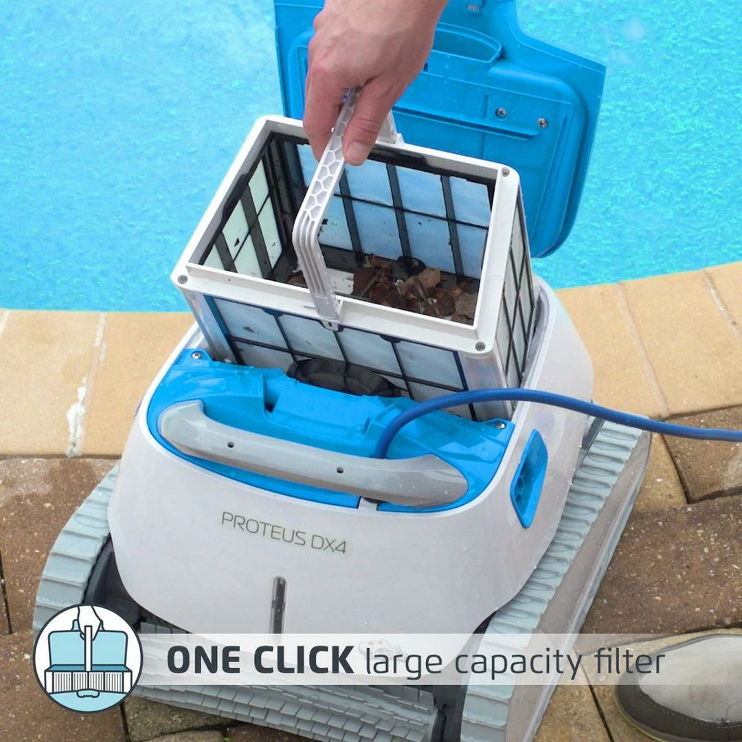 - Thanks to its unique intelligent scanning system, the Dolphin Proteus DX4 studies the different parameters of your pool and thus optimizes its capacity to scan the entire pool.