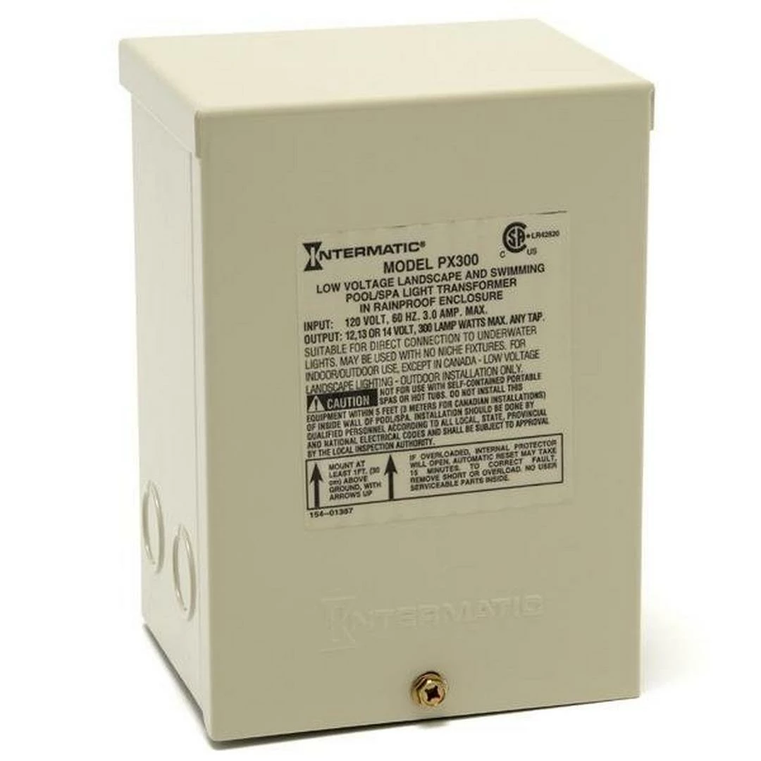 Intermatic PX300 Transformer Only 300W Capacity are specifically designed to supply 12 volts to pool/spa lights, submersible fixtures and outdoor garden lights. A grounded shield between the primary and secondary windings assures safe operation and the built-in circuit protection will disconnect power to the transformer in case of defect or overload.