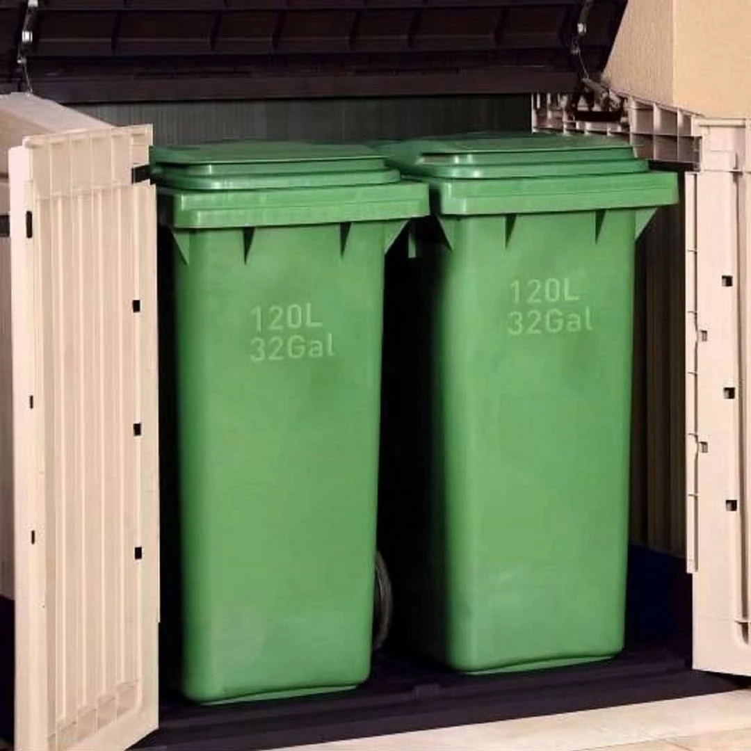 - Stores two 120 L/32 G trash cans