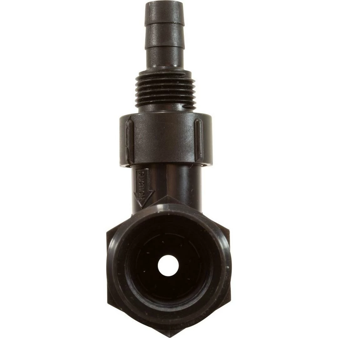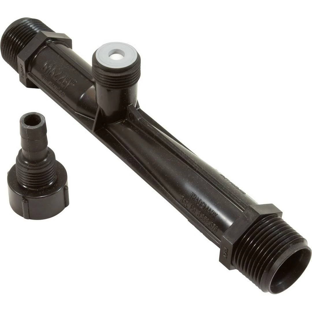 Mazzei Red Ozone Venturi #978 for high flow ozone systems. Ozone systems for spas and hot tubs use a Mazzei type of venturi ozone manifold to draw the ozone gas into the water line with suction. The narrow tube uses internal restriction to speed up the water and create a venturi ozone suction from the center mounted air hose connection, or injection fitting, pulling the ozone gas into the tee manifold. Mazzei venturi injectors are also used in aquariums, agriculture and industrial applications to add gas and liquid additives to water. Inside of the ozone hose connection cap is a ball and spring check valve, to keep water from entering the ozone hose.