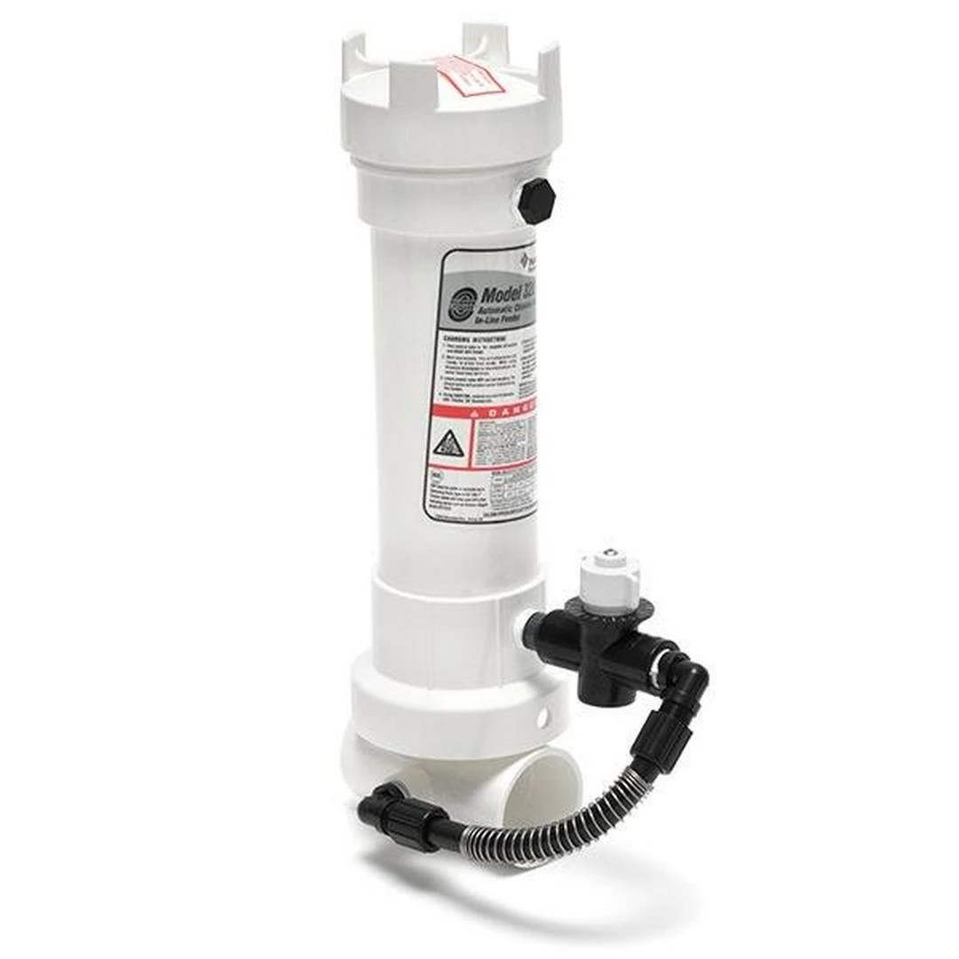 The Pentair Rainbow Model 320 Chlorine/Bromine Feeder sanitizes your water automatically without the worry of transporting or storing harmful chemicals. Installed in the return line of your pool and spa equipment, the Rainbow 320 Feeder features an enclosed design that prevents gas from escaping and requires no special venting to operate efficiently.